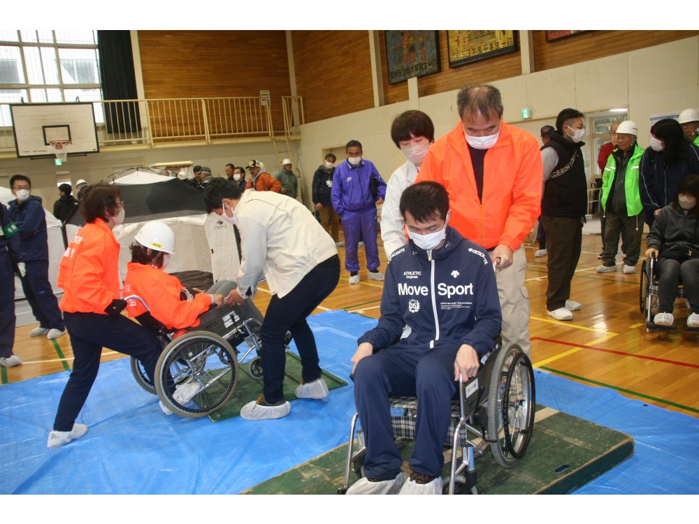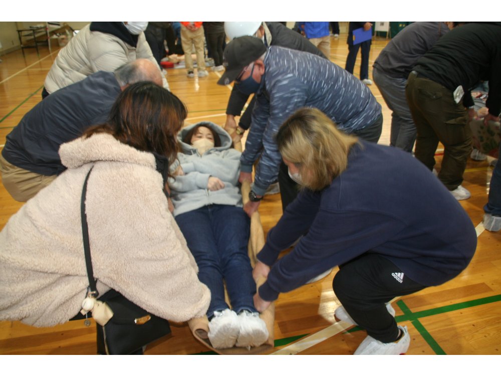 〇訓練内容:無線通信訓練、情報収集訓練、避難所受入れ訓練、1分間行動訓練、担架搬送訓練、車椅子補助訓練、応急救護訓練、避難区画体験訓練、給食給水訓練