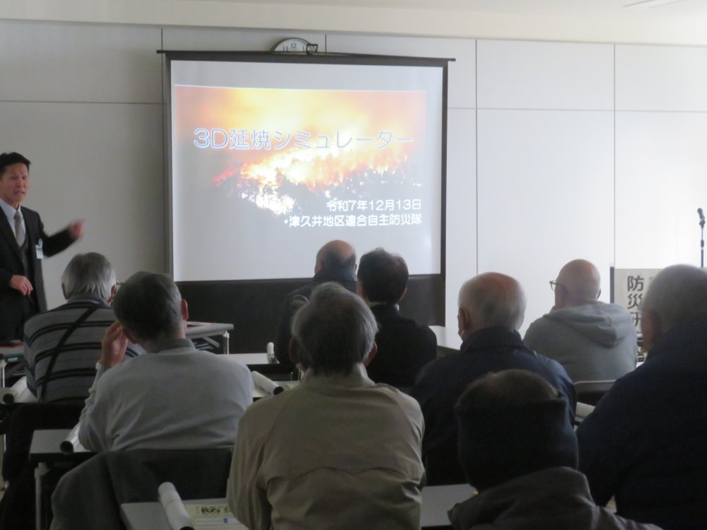 今年度の防災研修会は、講師を緑区地域振興課の防災訓練アドバイザーの方にお願いし、相模原市が運用を開始した「3D延焼シミュレーター」の視聴と自主防災組織や防災訓練等について話をうかがいました。